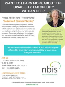 Please Join Us for a free workshop: “Budgeting & Financial Planning” It can be overwhelming trying to figure out finances after a stroke or brain injury. This interactive seminar will help you learn how to build a secure foundation and how small steps can protect you, your future and your loved ones. This session will give you the most up to date information on the Disability Tax Credit (DTC) and the Registered Disability Saving Plan (RDSP).