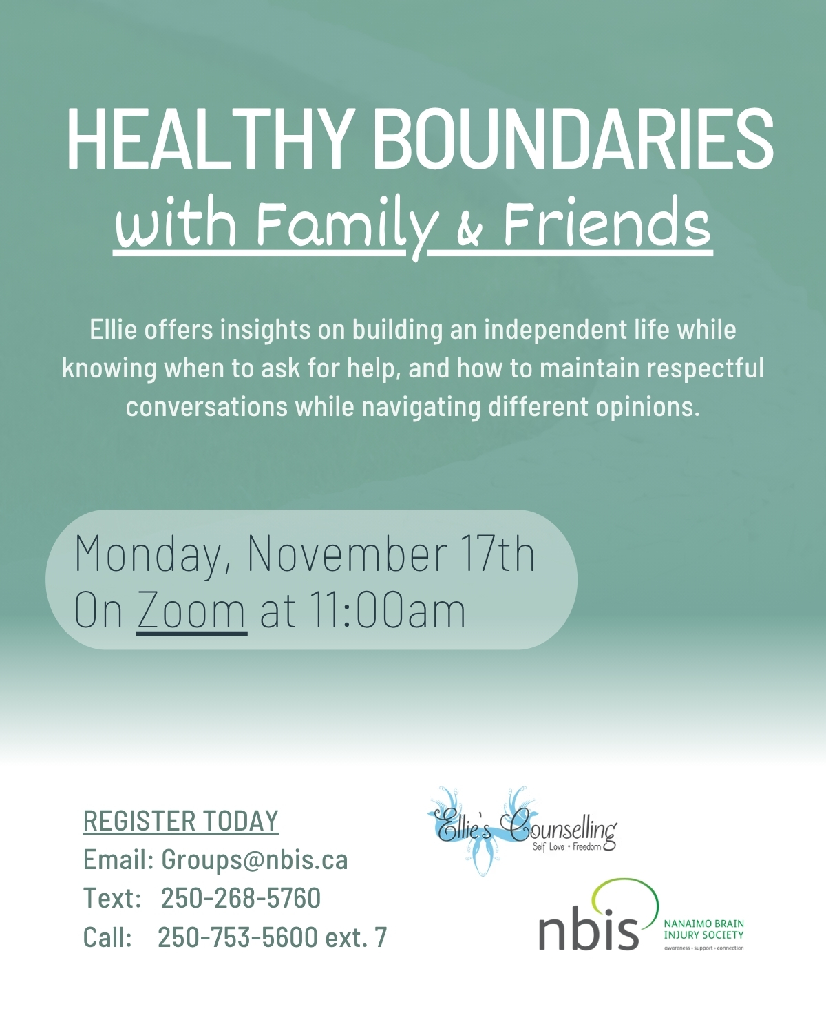 All Events This event has passed. Healthy Boundaries: With Family & Friends November 17 @ 11:00 am - 12:00 pm Add to calendar Google Calendar iCalendar Outlook 365 Outlook Live Details Date: November 17 Time: 11:00 am - 12:00 pm Event Category:Community Workshop, Group Event, Peer Support Website: https://www.elliescounselling.com/ Organizer Nanaimo Brain Injury Society Phone: 250-753-5600 Email: community@nbis.ca Website: View Organizer Website Venue Zoom 235 Bastion Street Nanaimo, 75007 Canada + Google Map Phone: 250-753-5600 Related Events Client Coffee Drop-in December 15 @ 1:30 pm - 3:00 pm|Recurring Event (See all)An event every week that begins at 1:30 pm on Monday, repeating until December 22, 2025 Virtual Client Drop- In December 16 @ 10:00 am - 11:15 am|Recurring Event (See all)An event every week that begins at 10:00 am on Tuesday, repeating until December 16, 2025 Social Program: Guided Painting December 18 @ 10:00 am - 12:00 pm|Recurring Event (See all)An event every week that begins at 10:00 am on Thursday, repeating until December 18, 2025